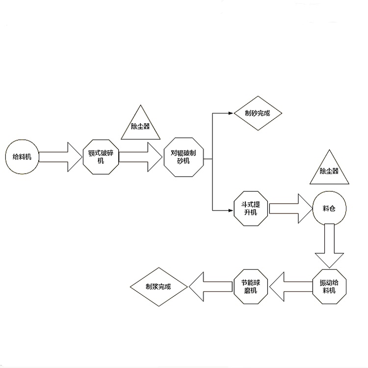 近日來(lái)自山東泰安的李總需要購(gòu)買煤矸石制砂制漿設(shè)備聯(lián)系到我們,根據(jù)他的需求我們?yōu)樗O(shè)計(jì)了方案。我們了解到李總的煤矸石原料為200mm,要求產(chǎn)量達(dá)到100噸,經(jīng)過(guò)具體分析我們?cè)O(shè)計(jì)了方案,需要使用到的設(shè)備有給料倉(cāng)、對(duì)輥制砂機(jī)、斗式提升機(jī)、料倉(cāng)、振動(dòng)給料機(jī)、節(jié)能球磨機(jī)各一臺(tái),顎式破碎設(shè)備和除塵器各兩臺(tái),具體工藝流程如下: